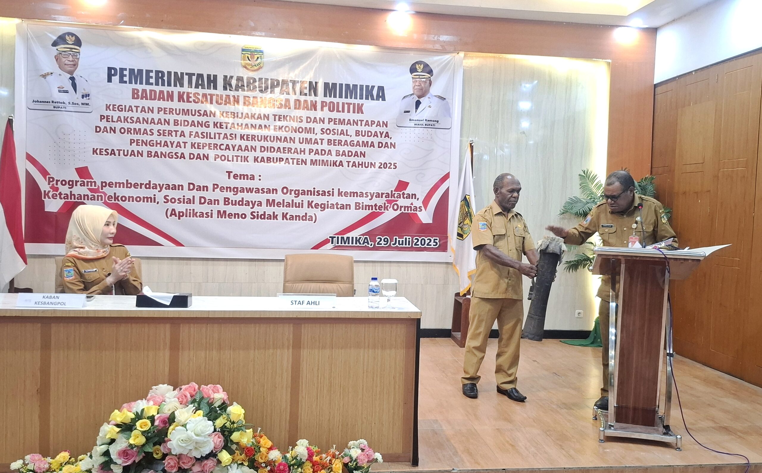 Timika – Pemerintah Kabupaten Mimika, Provinsi Papua Tengah melalui Badan Kesatuan Bangsa dan Politik (BKBP) Kabupaten Mimika menggelar kegiatan bimbingan teknis (bimtek) Aplikasi “Meno Sidak Kanda” sebagai upaya untuk meningkatkan koordinasi, pengawasan, dan transparansi kegiatan organisasi massa (Ormas), bertempat di Ruang Multipurpose Hotel Grand Tembaga, pada Selasa (29/07/2025).