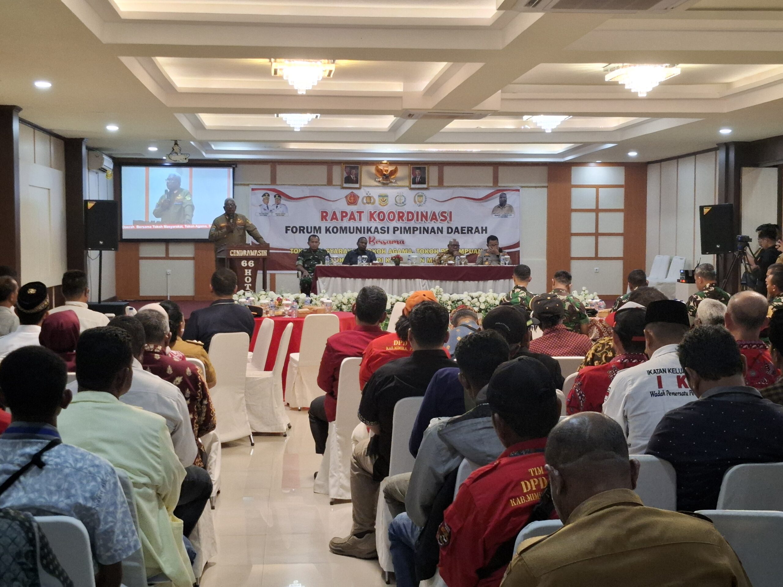 Timika – Badan Kesatuan Bangsa dan Politik (Bakesbangpol) Kabupaten Mimika menggelar Rapat Koordinasi Forum Komunikasi Pimpinan Daerah (Forkopimda) bersama tokoh masyarakat, tokoh agama, tokoh perempuan, dan tokoh pemuda. Kegiatan ini berlangsung di Ballroom Hotel Cenderawasih 66, Selasa (02/09/2025).