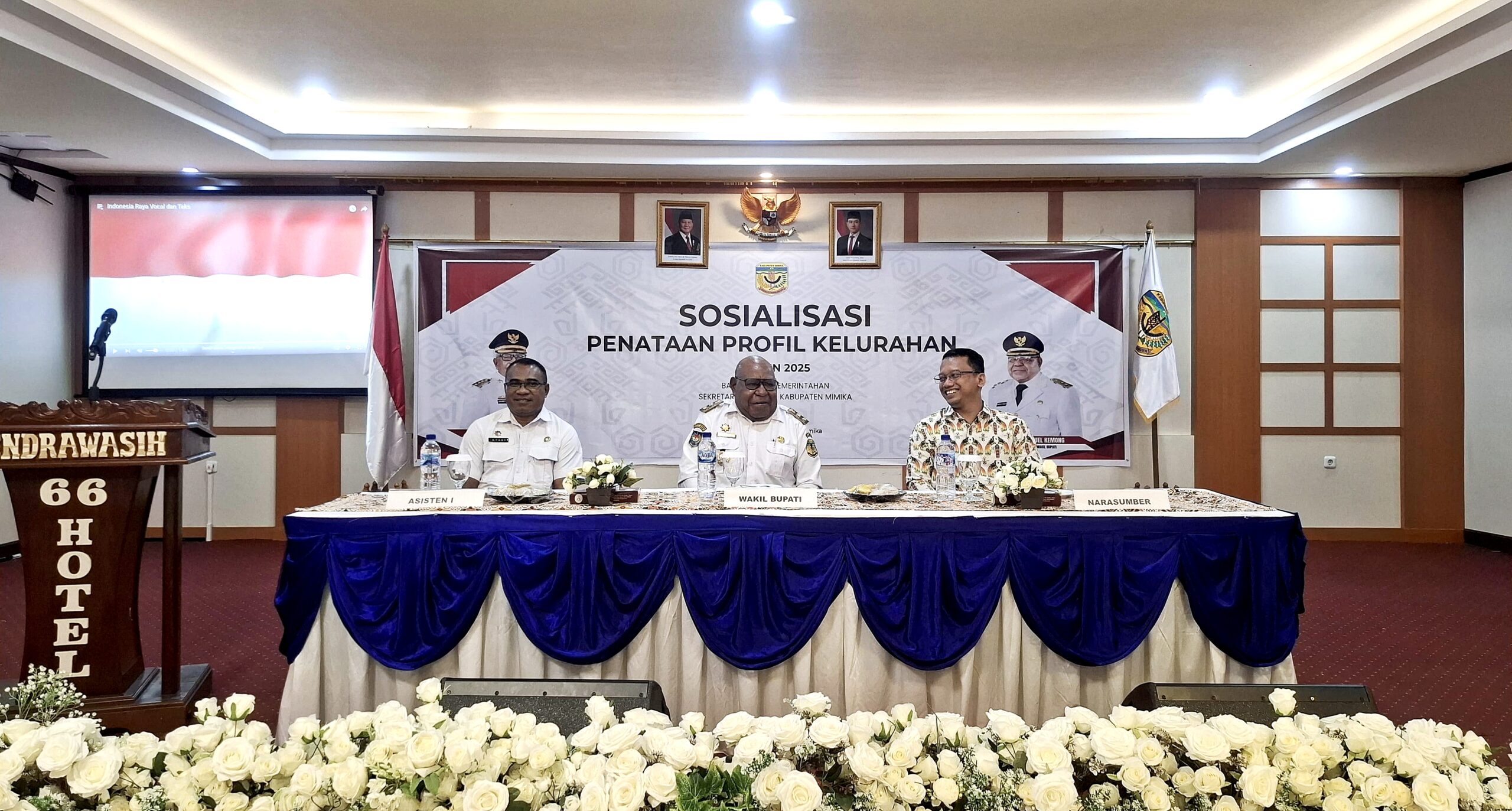 Mimika — Pemerintah Kabupaten Mimika melalui Bagian Tata Pemerintahan Setda Mimika menggelar kegiatan Sosialisasi Penataan Profil Kelurahan Tahun 2025 yang berlangsung di Hotel Cenderawasih 66. Kegiatan ini dibuka secara resmi oleh Wakil Bupati Mimika, Emanuel Kemong, turut hadir dalam kegiatan tersebut Asisten Bidang Pemerintahan dan Kesejahteraan Rakyat, Drs. Ananias Faot, M.Si, Kepala Badan Perencanaan Daerah Kabupaten Mimika Yohana Paliling, M.Si. Rabu (23/07/2025).