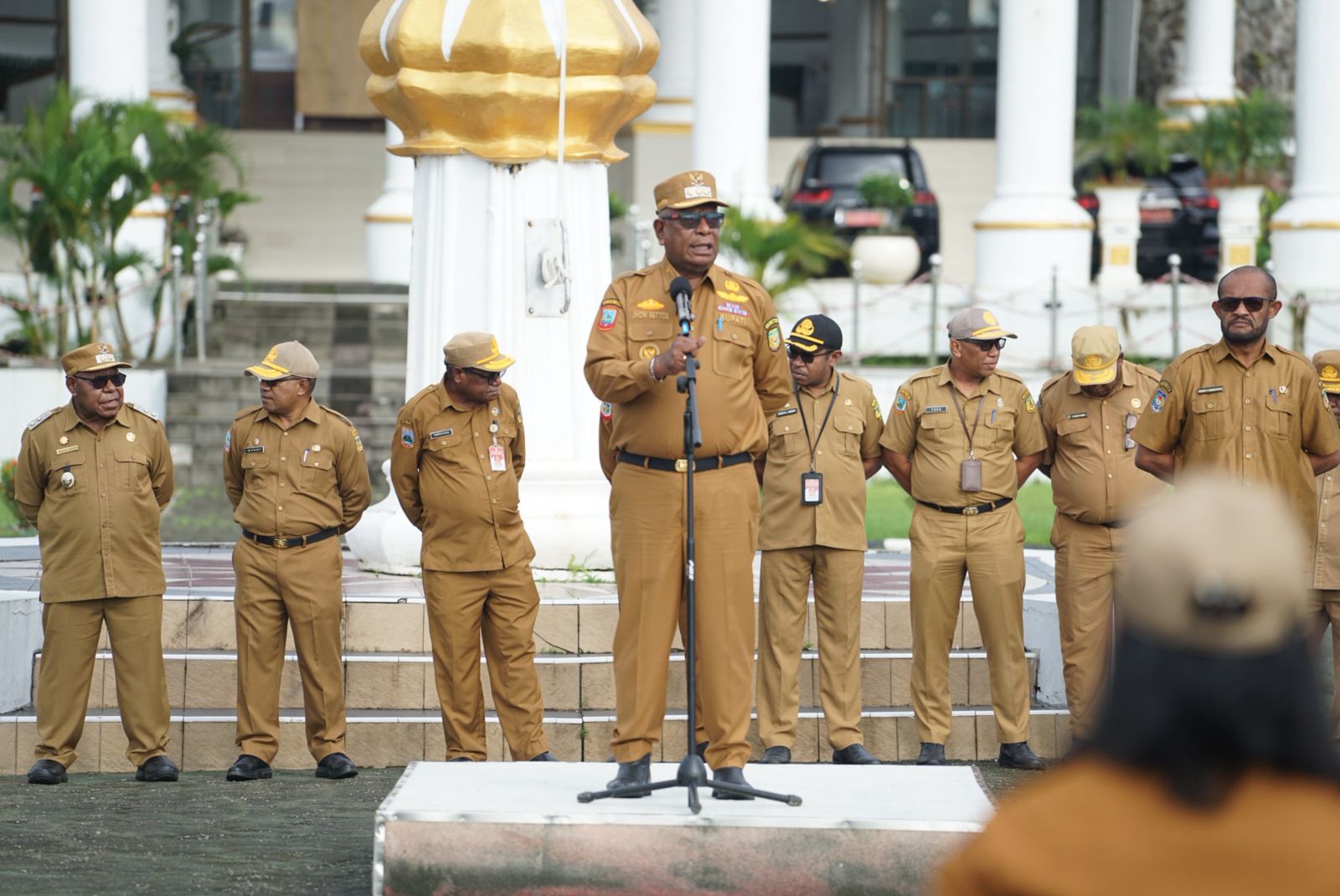 Bupati Mimika dalam arahannya menyampaikan ucapan terimakasih atas perhatian dan kesetiaan kita didalam melaksanakan tugas-tugas kita secara khusus, kita tunjukkan bahwa apel pagi ini merupakan sarana untuk melihat tingkat kedislipinan. Bahwa kita sebagai aparat pemerintah, aparat yang melaksanakan birokrasi pemerintahan. Aparat yang kemudian akan melaksanakan pelayanan kepada masyarakat. Kita harus mulai dari diri kita sendiri, bagaimana cara berpakaian, penampilan kita, wajah kita menunjukan bahwa orang akan datang. Kita bisa menunjukan bahwa kita disiplin dalam melaksanakan tugas kita, kalu kita disiplin tentunya pelayan juga akan baik kepada masyarakat. Tugas kita hanya satu, bagaimana pelayan kita yang baik kepada masyarakat.