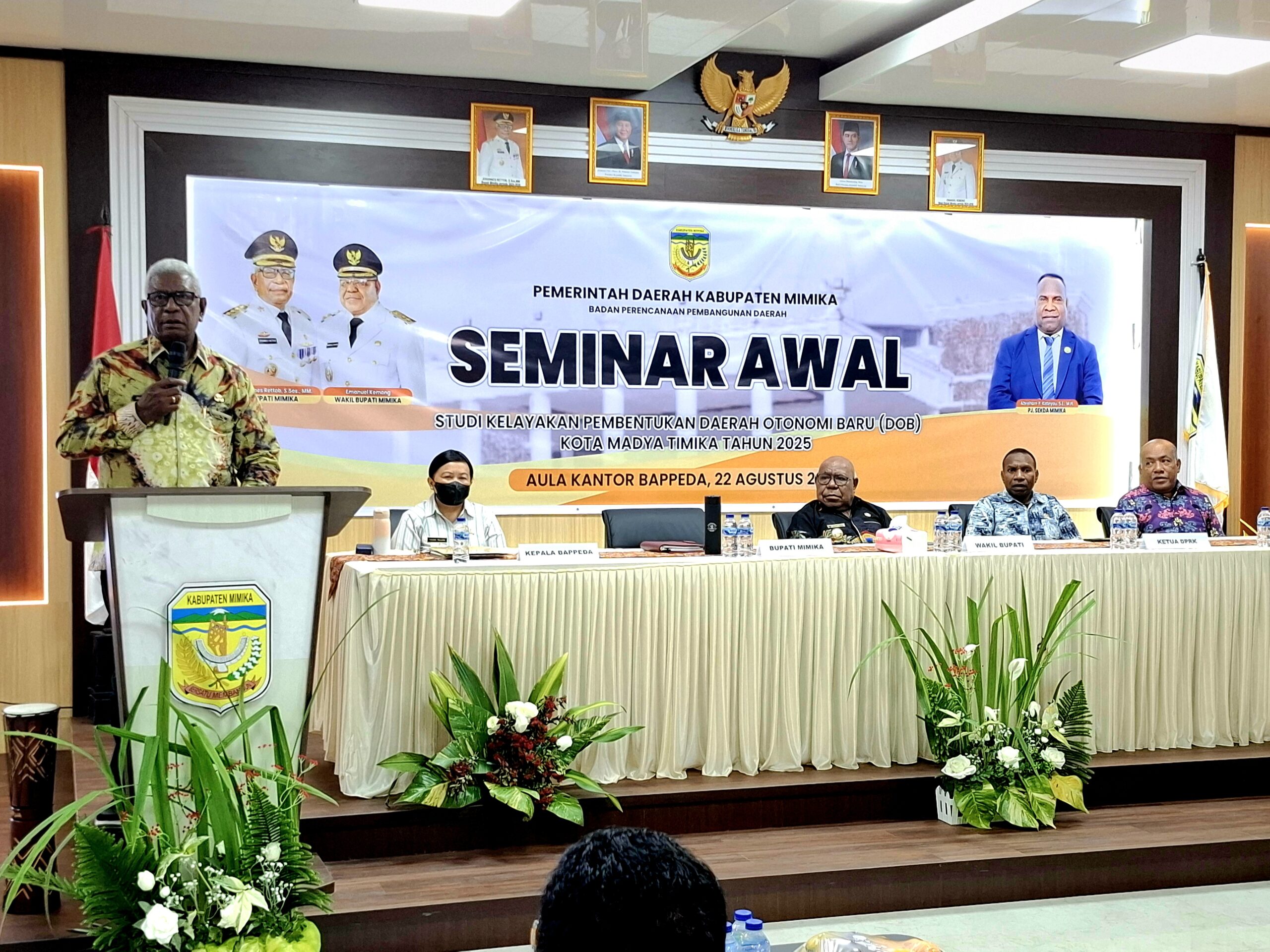 Timika – Pemerintah Kabupaten Mimika melalui Badan Perencanaan Pembangunan Daerah (Bappeda) menggelar Seminar Pendahuluan Studi Kelayakan Pembentukan Daerah Otonomi Baru (DOB) Kota Madya Timika Tahun 2025, yang berlangsung di ruang pertemuan Bappeda Kabupaten Mimika, Jumat (22/08/2025).