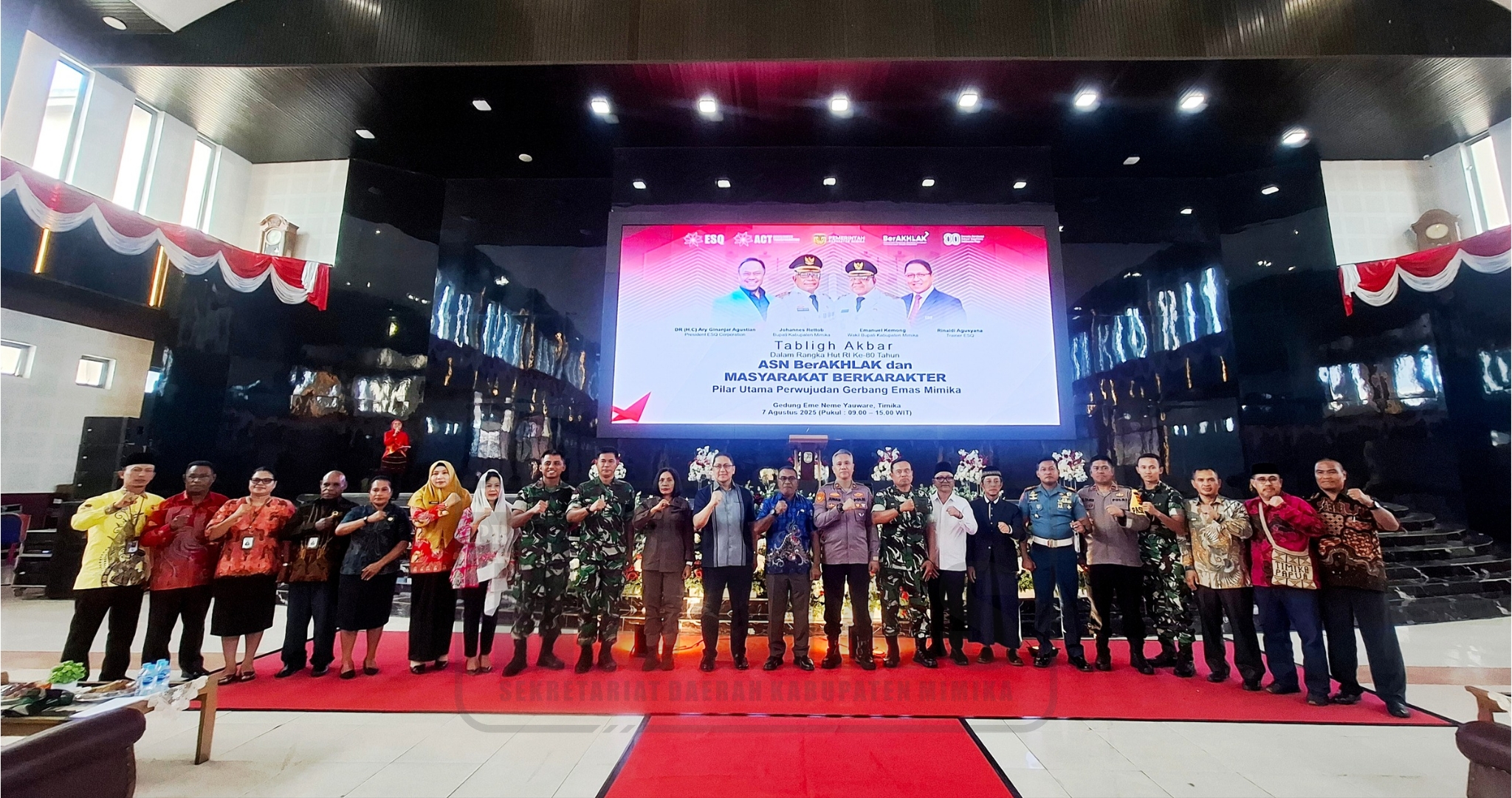 Timika — Dalam rangka memeriahkan peringatan Hari Ulang Tahun ke-80 Kemerdekaan Republik Indonesia, Pemerintah Kabupaten Mimika, Provinsi Papua Tengah melalui Bagian Kesejahteraan Rakyat Setda Mimika menggelar Tabligh Akbar bagi Aparatur Sipil Negara (ASN) dan Masyarakat. Kegiatan ini berlangsung di Gedung Eme Neme Yauware, Timika, dengan menghadirkan narasumber nasional sekaligus motivator kenamaan Rinaldi Agusyana. Kamis (07/08/2025)
